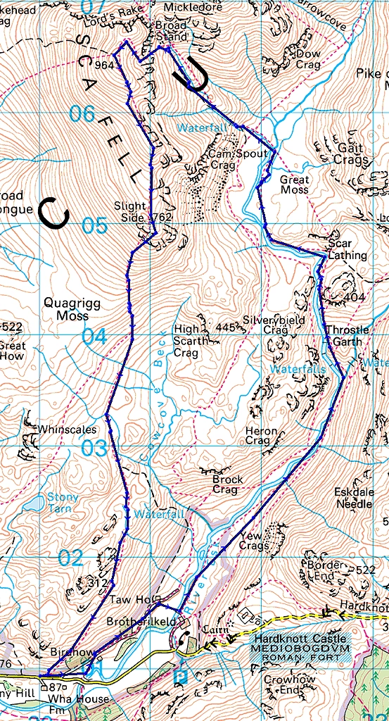The route will be north west along a lane towards Brotherikeld crossing the Esk to the left bank via a footbridge and then onto the footpath that runs up the east side of the Esk and climbs towards it's source, eventually reaching Great Moss. From here we will leave the Esk and climb steeply up left towards Broad Stand and Mickledore (the col between Scafell and Scafell Pike), and on turning left before reaching Broad Stand we will find the climbing path that leads onto Scafell summit, this being at first a gully scramble and then steep scree slope. On leaving the summit we will head south over Slight Side before descending into Quagrigg Moss, crossing the moss southwards will bring us back to the parking place.