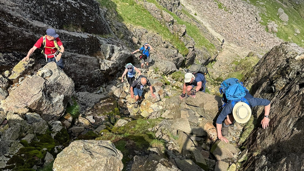 This will be a long and challenging mountain walk of around 10 miles with a lot of climbing (around 3250 feet of ascent) and rough terrain to negotiate, including a scramble up a gully — see image from 2024 walk below. That's me with a dog ornament round my neck).