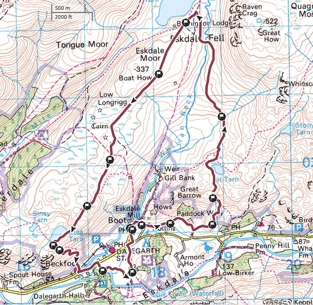 The route starts from the The Boot Inn, grid reference NY1762701039, what3words: unlocking.lays.lies. There is parking at the Boot Inn, or paid parking at Dalegarth station just down the road.