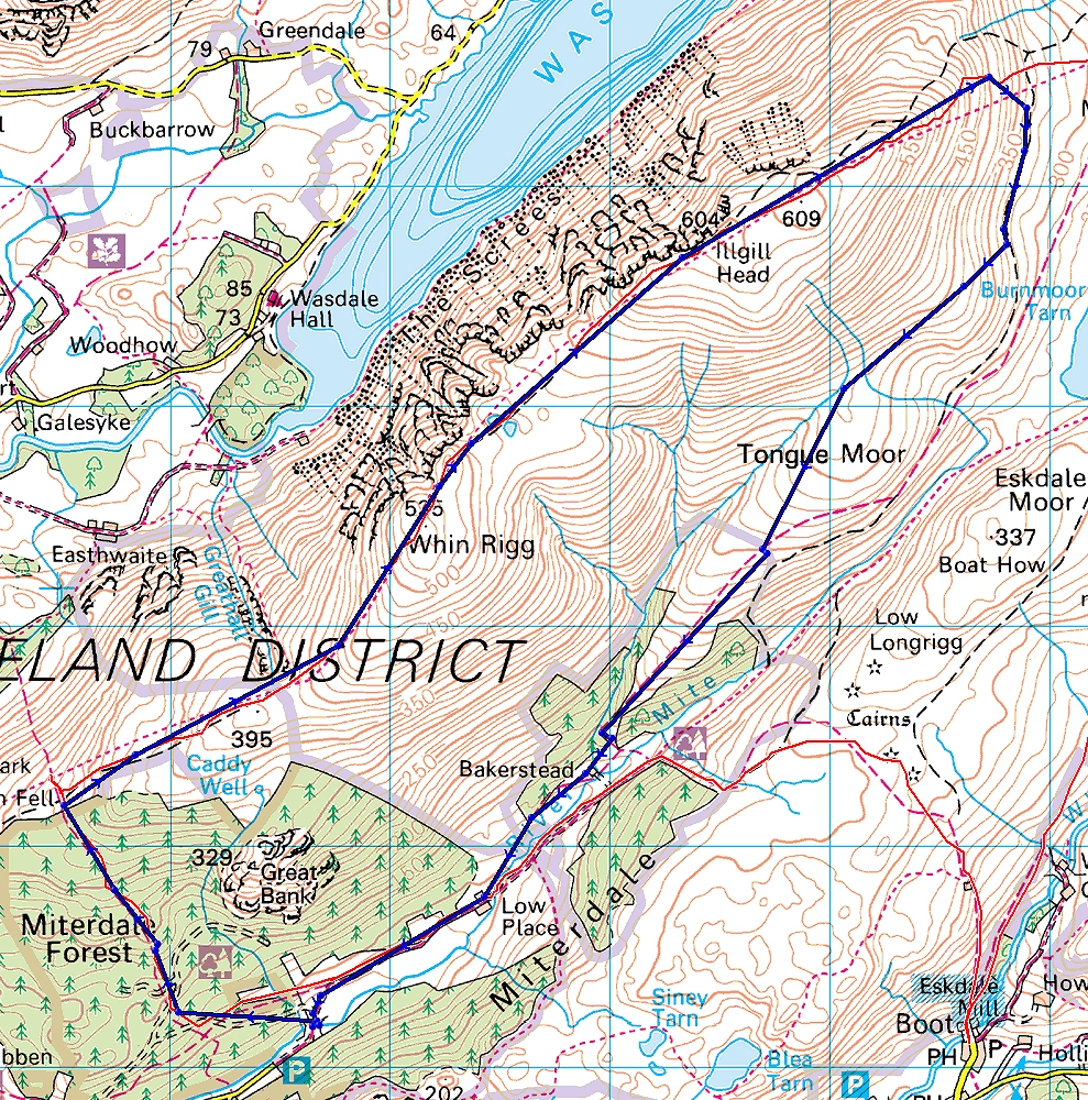 The route will be up onto and along the Whin Rigg / Illgill Head ridge as described above and on reaching the northeastern end of the ridge descends towards Maiden Castle before turning back southwest and following the course of the Mite back to the start point.